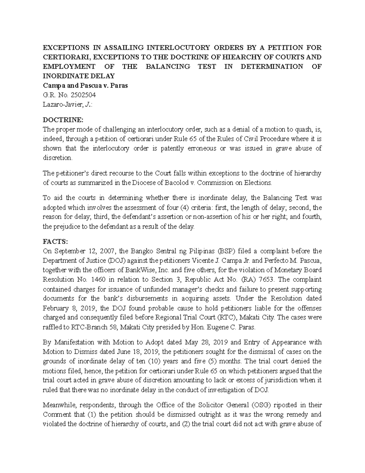 Campa Pascua V Paras Case Digest Exceptions In Assailing Interlocutory Orders By A Petition For Studocu